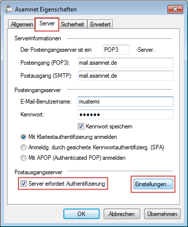 Wechseln Sie auf die Registerkarte Server und setzen Sie nun den Haken bei Server erfordert Authentifizierung. Klicken Sie anschließend auf Einstellungen.