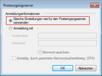 Wählen Sie Gleiche Einstellungen wie für den Posteingangsserver verwenden aus und klicken Sie dann auf OK. Nun haben Sie die Einrichtung von SMTP-Auth abgeschlossen und Sie können die Einstellungsdialoge wieder schließen.