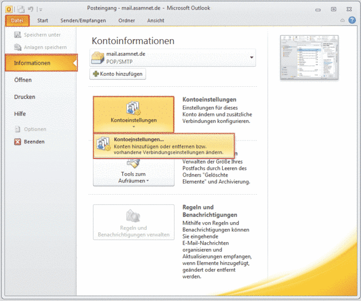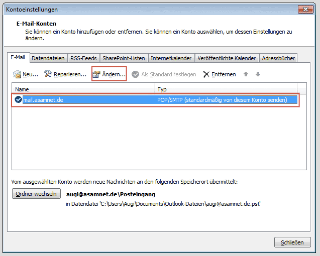 Wählen Sie Ihr ASAMnet-Konto in der Liste aus. Outlook bennennt die Konten in der Standardeinstellung nach dem verwendeten Mailserver, also "mail.asamnet.de". Wenn Sie dafür manuell eine andere Bezeichnung vergeben haben oder mehrere Postfächer haben, kann das Konto möglicherweise auch anders heißen. Haben Sie Ihr ASAMnet-Konto ausgewählt, klicken Sie als nächstes auf "Ändern".