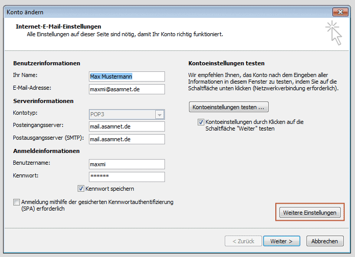 Klicken Sie auf "Weitere Einstellungen..."  es öffnet sich folgendes Fenster mit mehreren Karteireitern. Klicken Sie dort auf Postausgangsserver.