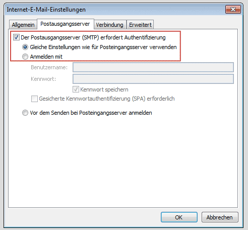 Um SMTP-Auth zu aktivieren, schalten Sie die Option "Der Postausgangsserver (SMTP) erfordert Authentifizierung" ein. Ist das Häkchen gesetzt, können Sie den Dialog wieder verlassen, indem Sie auf "OK" klicken. Das Auswahlfenster für die E-Mail-Konten kann ebenfalls geschlossen werden. Damit ist die Einrichtung beendet.